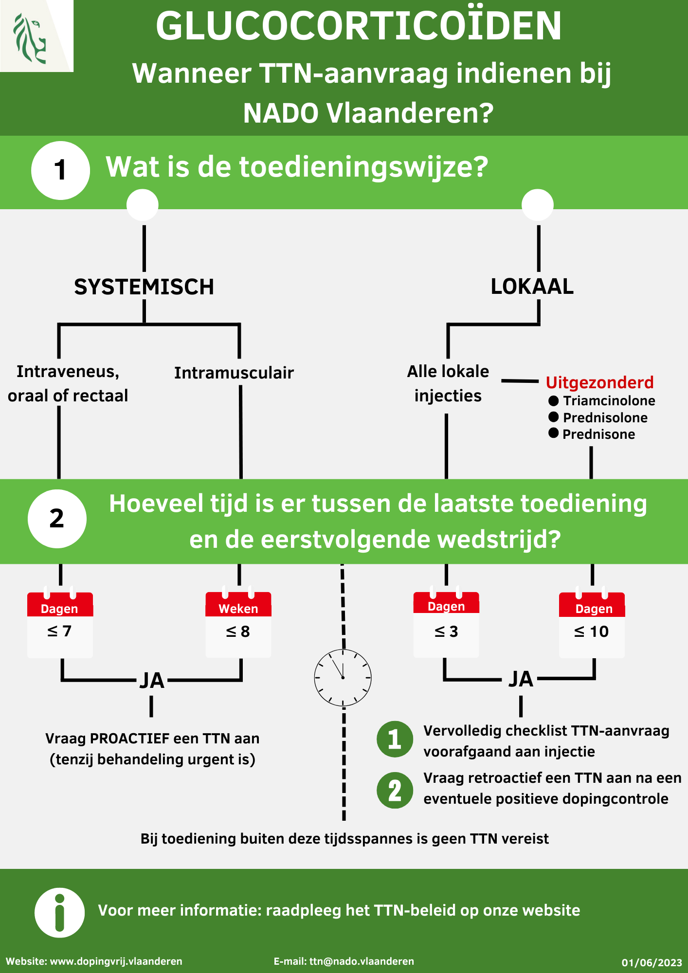 Bezorg je ingevulde aanvraag aan Nado Vlaanderen. Dat mag per e-mail (ttn@dopingvrij.vlaanderen) of per post (SV NADO, Koning Albert II-laan 15 bus 274 1210 Brussel)